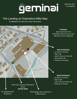 Geminai LLC, 55 Middlesex Street, Suite B316, N. Chelmsford, MA. Building B. Third Floor. Across from Nova Art Studio. Call Joanne Stanway at 978-273-1473 if you’d like a ride up the historic mill building’s freight elevator.